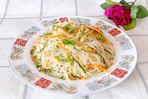 4. 凉拌:将沥干水分的粉丝放入大碗中,加入切好的蔬菜,再加入适量的生抽、陈醋、香油、盐、糖、辣椒油、蒜泥等调料,搅拌均匀。